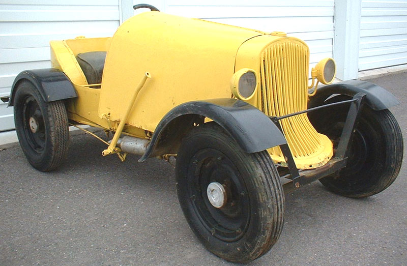 This yellow 1930's American Austin is an all-original vintage open midget race car ready to be driven or shown. It was built at the ship yards in Los Angeles during WW II. It was raced and driven on the street in Los Angeles, then sold and driven to South Dakota. It has a 1946 South Dakota title. The fenders and rear bumper were added when it was made street-legal. The headlights are late 20's cowl lights. The front axle and rear end were narrowed. The hubs were adapted to take 12" rims. The modified drive train is early 1930's Austin American. The Austin American 46 CID L-head 4 cylinder motor, radiator and shell, 3 speed manual transmission and differential are complete. The grill bars are 1934 Ford. The midget runs and drives great and is fairly fast. Here is an exceptional opportunity to own a truly original early midget race car. Please call 406 318-0270 for details about this restorable classic project car.