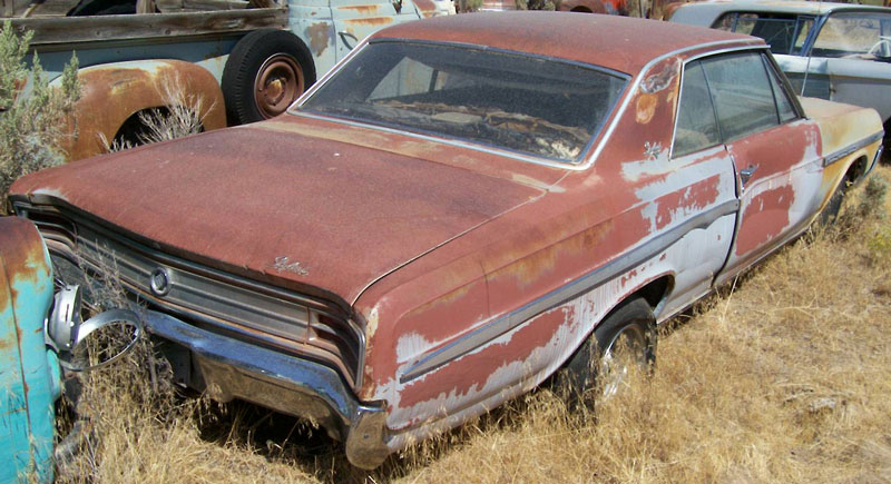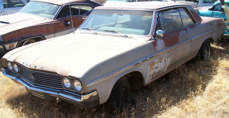 This grey 1964 Buick Skylark 2 door hardtop sport coupe is a very solid, dry car ready to be restored or customized. The body has very dry. solid sheet metal. The right door is damaged. The right door trim is missing and the right quarter trim is damaged. The right rear bumper, deck lid and back of quarter panel are damaged. All the glass is good. The optional black vinyl bucket seat interior is all there. The floors are solid. The 225 CID 155 HP V-6 motor, automatic transmission and radiator are gone. The car has power steering. This is a nice dry desert 64 Skylark sport coupe and could be restored or turned into a custom street rod or muscle car. Please call (406) 316-0270 for details about this restorable classic project 64 Skylark Sport Coupe.