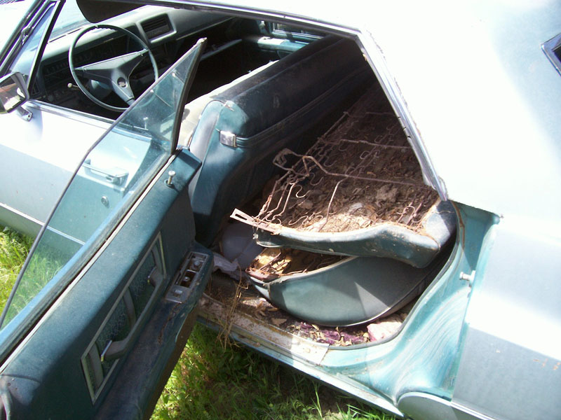 This Cobalt Firemist 1966 Cadillac Series 682 Calais four door hardtop is a very solid, straight, complete car ready to be restored. The car has optional air conditioning. The body has very straight, solid western desert sheet metal, except there is a dent in the back of the right front fender. There are a few small dents here and there. The top grill trim bar is broken. Otherwise, all the trim is there and the grill and bumpers look good. The windshield and rear glass are broken. The right rear glass may or may not be there. The hubcaps are gone. The blue interior is all there and the dash is complete. There are a few misc. interior parts missing. The fuse block is out and on the floor. The floors are solid. The rear seat is not installed. The 429 CID 340 HP V-8 motor and hydra-matic automatic transmission are all there. The hood is stuck so there are no engine compartment photos. The running and driving condition is unknown. Don't miss the opportunity to restore a big boat 66 Calais 4 door hardtop. For sale $2,000.