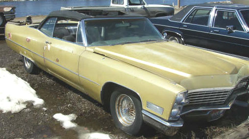 This Baroque gold and black 1967 Cadillac DeVille convertible is a nice original classic ready to be restored or customized. The car has power windows, seat, brakes and steering with optional air conditioning. The body is straight and solid except there is rust in both front fender tails. The grill and bumpers are good and all the trim is there. There are a couple small area on the right side that have been filled and sanded. The car has aftermarket chrome wire wheels. The top assembly is all there. The top needs to be replaced. The black interior is all there. The dash is complete. The 429 CID 340 HP V-8 motor and automatic transmission are all there. The running and driving condition are unknown. Here is your opportunity to restore a very cool big boat 67 Caddy convertible. Please call (406) 318-0270 for details about this restorable classic 67 Caddy convertible project car.