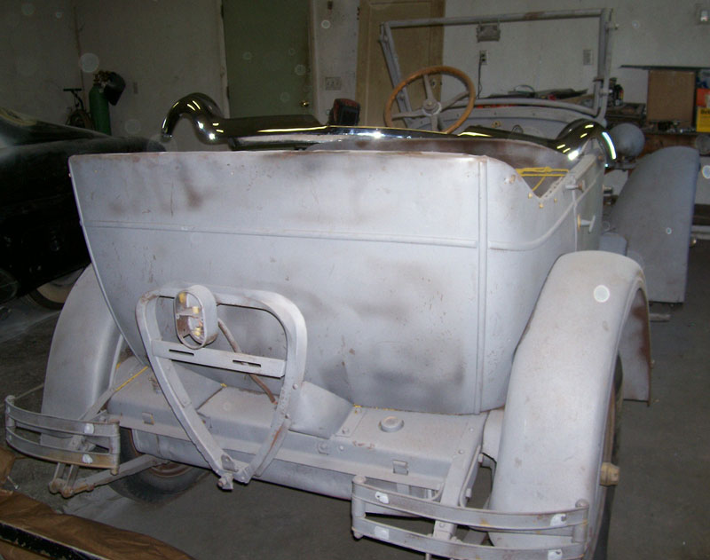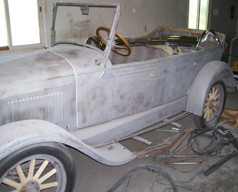This grey primer 1925 Chevrolet Superior Series K Four touring car is a very solid, straight car ready to be restored. The body sheet metal is excellent. There are no running boards or top. The radiator shell is broken at the bottom. The headlight rings have some dents. The interior is all there. Two of the side windows are there. Most of the wood has been recently redone. The seat cores are all there. The 171 CID inline four cylinder OHV 26 HP motor and three speed manual transmission at very complete. The motor was said to have been rebuilt years ago and it was running when we bought it a couple years ago. We have not driven it so it's roadability is unknown. The wooden spoke wheels appear to be in good condition. This is an opportunity to finish a nice 25 Chevy touring car with great sheet metal and most of the wood redone. Please call (406) 318-0270 for details about this restorable classic project car. For sale $4,500.