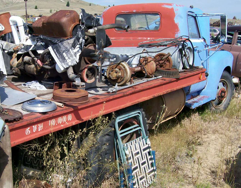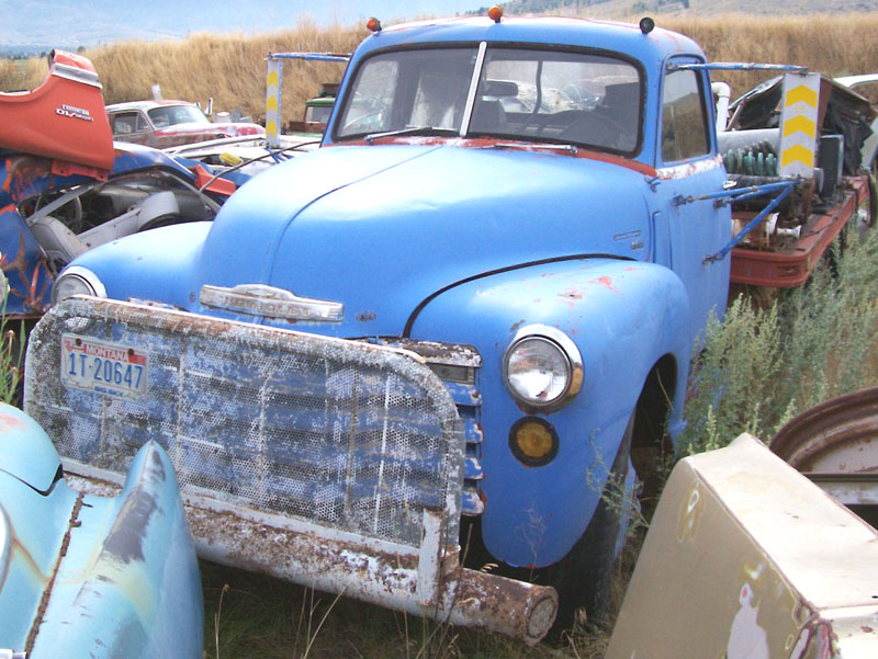The blue 1950 Chevrolet Series 6400 2 ton flatbed truck is a very straight, complete project truck ready to be restored. It has a commercial steel flatbed with a wood floor and shop-made dual 50 gallon fuel tanks. It has a few small dents in the body. The right lower rear cab corner is rusted and there may be rust in the left side but it doesn't show. Otherwise, the sheet metal is solid. There is a dent in the right rear corner of the roof and in the right front fender. There is a small hole cut under the right door handle. The truck has a shop-made heavy-duty combination grill guard and front bumper. The truck has non-stock triple roof running lights and the left side lens is missing. It also has non-stock turn signal lights under the headlights. and non-stock side mirrors. The interior is all there except the radio is gone. There are add-on gauges under the dash and one gauge is missing. The 235 CID 105 HP HP OHV inline six cylinder motor was running but the block is cracked on the left side from freezing. The 4 speed manual transmission and drive train are all there. This is a nice truck and with a new block, paint and interior, the heavy commercial flatbed could be put back to work.