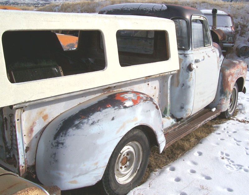 This 1951 Chevrolet 3100 1/2 ton 5 window pickup is a nice, complete project truck ready for restoration. There are a few small repairable dents in the optional chrome grill. the front bumper is good. The "3100" side hood badges are missing. The right rear fender has a repairable dent and there is some rust at the bottom in the back. Sherman patch panels are available for every area of this truck. The truck has a heavy-duty aftermarket rear bumper. There is some rust at the bottom back of the right front fender. There is a small dent in the front of the left front fender. A good left door in in the pickup bed. The floors have rust in the front corners and in the lower corners of the front door frames. The dash has a hole cut out in the center. The gauges are there. The glove box door is missing. The seat is there. The door panels are missing. The curved corner glass is good. Both lower rear cab corners are rusted. The tail gate is good. The bed is solid and has been lined with a steel sheet. The motor is complete under the hood. the running condition is unknown. The radiator is in the pickup bed. The chassis is good and rust-free. The truck has a good Montana title. Good 50's Chevy 1/2 ton 5 window pickups are at the top of many restorers and rodder's wish list. Don't miss this one at a very low price. Please call (406) 318-0270 for details about this 51 Chevy five window pickup.