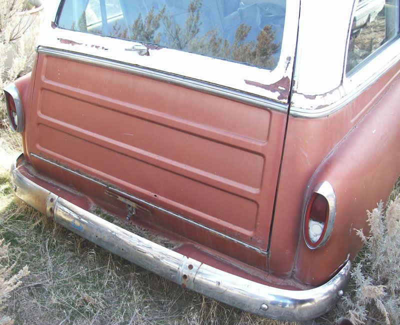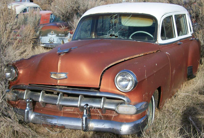 This Pueblo tan and white 1954 Chevrolet 150 One-Fifty 4 door station wagon is a complete classic car ready to be restored or customized. The windshield is broken. The tailgate glass is good. The right headlight trim ring is gone. The wiper blades are missing. The center hood trim is dented at the front bottom. The top grill bar is dented. There are a few dents in the left front fender and front door. There is rust in the bottoms of all for door skins. The rockers look solid. The tail lenses are broken. There is rust in the bottom of the lower tailgate. The rear bumper guards are gone. The hubcaps have some dents. The wagon has a red and white interior. All four door panels and door handles are missing. The dash and gauges are all there. The front seat has a cover. The rear seat is folded down. The front floors have some rusted through areas but the rear floors look ok but have not been completely inspected. The parts stored inside are not for this car. The 235 CID OHV inline six cylinder motor and 3 speed manual column shift transmission are all there. Nothing has been taken off the motor and it looks like a runner but the actual running and driving condition is unknown. Here is your chance to restore a desirable 54 Chevy family station wagon. Please call (406) 318-0270 for details about this restorable classic project car. For sale $4,500.