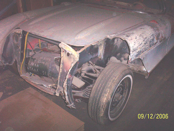 This red 1957 Chevrolet Corvette Roadster FI project has front end damage but the rest of the car is good and ready to be restored. It is an early 1957 FI fuel injected car. The fronts of the fenders are crushed. The grill surround is cracked. It is likely car needs a new front body clip. The car has the correct 3/8" gas line for the fuel injection model. The body was loosened on the frame when the car was wrecked. The owner has the grill bar and teeth, 58-59 tail light assemblies, correct steering wheel and a bunch of NOS chrome molding. The rear bumpers are in the trunk. The top is cracked. There is a good windshield. The seats are there. The gauges and radio are gone. There is a replacement front dash molding. The car has no motor or transmission, but comes with a later 57 FI short block and correct 4360 fuel injection unit with distributor and air cleaner. The car has a good title that matches the frame number and a blank ID tag that needs to be stamped (original was gone). There were only 6,339 57 Vettes made and finding unrestored projects are getting hard to find. Please call (406) 318-0270 for details about this 57 FI Vette. For sale $35,000.