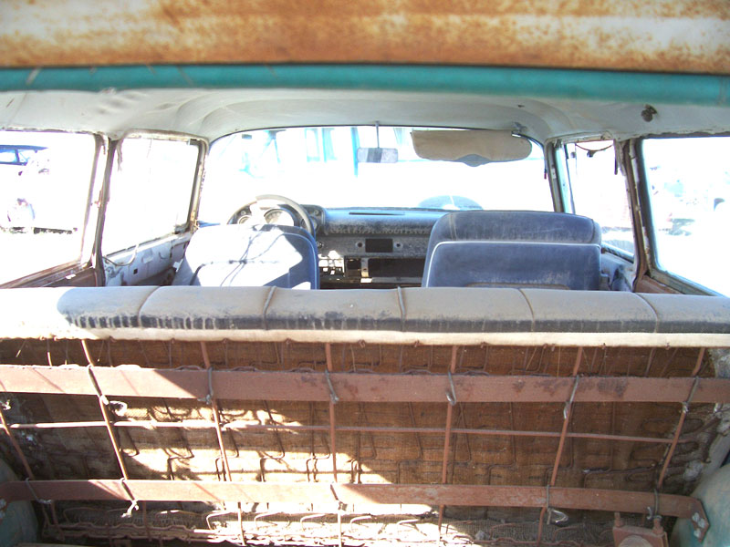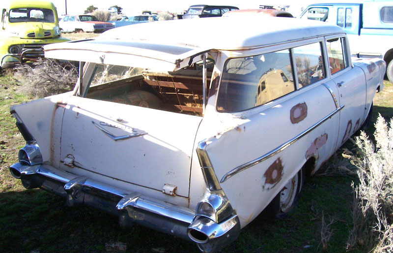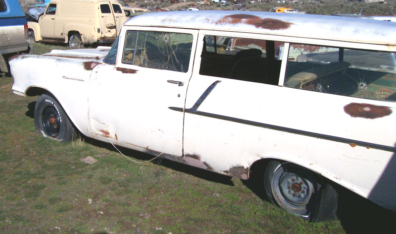 1This India Ivory 1957 Chevrolet One-Fifty 150 2 door station wagon is a partially complete rolling body and chassis classic car ready to be restored or customized. The body looks solid but there has been some filler work done. The front bumper, grill and trim are missing. The left door is dented. The right rear quarter is damaged. Some of the fin trim is missing. The side trim is all there but the right quarter trim is dented. The rear bumper is dented. The body looks solid. All the curved glass and some of the flat glass is broken. The car has a black interior. There is no front seat. The rear seat is there. The floors look solid. There is a shifter hole cut in the floor. The steering column shifter is missing. This was a 235 CID. OHV six cylinder car with manual brakes and steering. The radio is missing. The steering wheel is not stock. There is no motor, transmission or radiator. Here is your chance to restore or customize a hard-to-find 57 Chevy 150 two door station wagon.For sale $7,000.