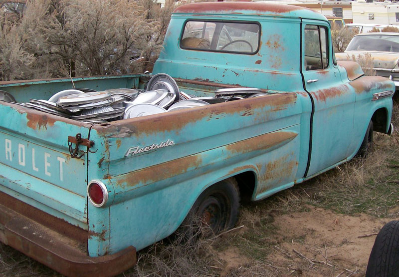 This Mint Green 1959 Chevrolet Model 3A Apache 3100 1/2 ton Fleetside 114" wheelbase pickup is a very solid and complete classic truck ready to be restored or customized. The body has dry and solid western desert sheet metal. The right door mirror and antenna nut are missing. The left door is sprung and the sheet metal is damaged on both sides of the seam. There are some dents behind the left rear wheel well. The tail gate is dented along the top and there are add-on side latches. There are some dents in the top back of the left side of the box. The truck has a heavy-duty tow bumper. The front seat is not stock. The blue dash and gauges are all there. The passenger ash tray is bent. There is an add-on under-dash radio. The steering wheel is not stock. The shift handle knob is gone. The 235 CID 135 HP OHV inline six cylinder motor and 3 speed manual column shift transmission are all there. Nothing is off the motor and it looks like a runner but the actual running condition is unknown. Here is your chance to restore or customize a very popular 59 Chevy Apache pickup. Please call (406) 318-0270 for details about this restorable classic project truck.