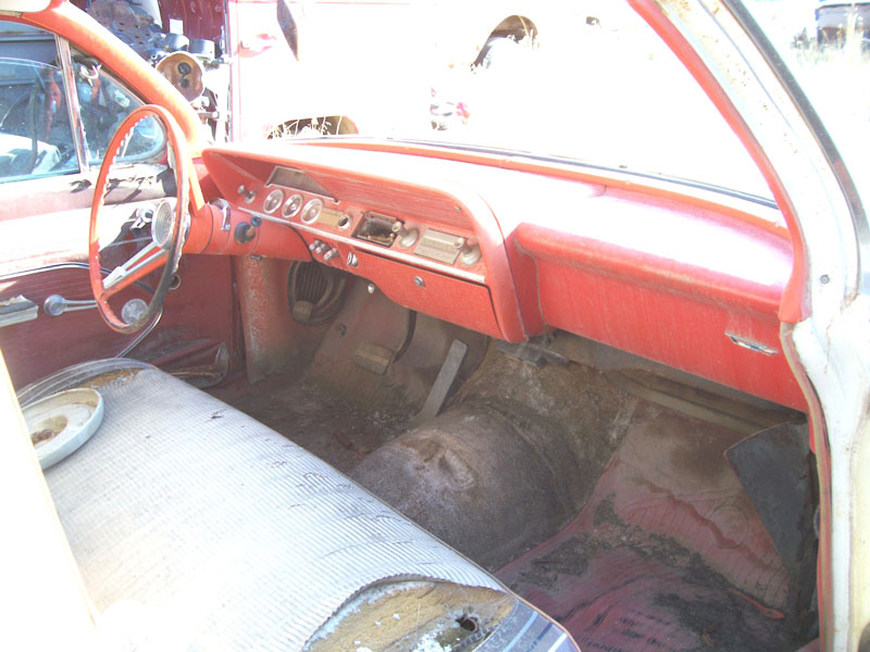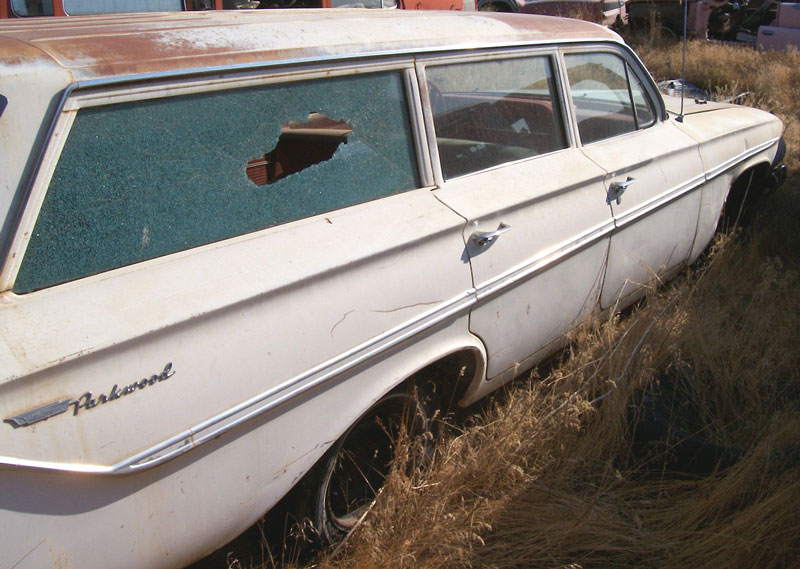 This white 1961 Chevrolet Bel Air Parkwood 6 passenger station wagon is a fairly straight classic car ready for restoration or customization. Since the photos were taken, the front fenders and inner fenders have been stolen. Most of the remaining exterior trim is there. The windshield and trim are missing. The right rear side glass is broken. The grill is missing. There are minor dents on the right side. There is rust behind both rear wheels at the bottom. The tail gate is good. The tail lights are gone. The red interior is all there, except some door handles are missing. Someone stole the steering column and dash gauge cluster since these photos were taken. A good gauge cluster comes with the car. The floors are solid. The 283 CID V-8 and Powerglide automatic transmission are gone. We have located to front fenders with are rusted around the headlight and fender tails. We have good cut out front headlight areas that can be used to repair the fender set. The fender tails will need patch panels. There is no trim on these fenders. There are no photos of the replacement parts and they will be pulled at the time of sale. The car is $3,500 the way it is and $5,000 with the mentioned replacement front fenders.