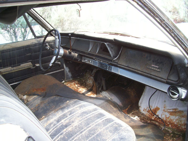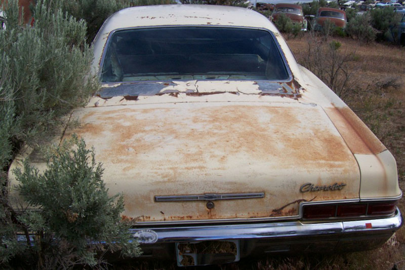 This yellow 1966 Chevrolet Impala 2 door hardtop is a straight, solid project car ready to be restored or customized. This car had air conditioning, power steering and power brakes. The front clip has been replaced. The right front corner is dented. The left lower bumper grill is bent. There is a dent in the left door and quarter door jam. There is some rust around and behind the left rear wheel well and the left edge of the deck lid. The trim on the left rear corner is damaged. The paint is peeling in the back and there is surface rust showing in the peeling areas. All the glass is good. The black interior is all there except the radio is missing. The floors are solid. The 283 CID V-8 motor, air conditioning components, automatic transmission and radiator are gone. This desirable yellow and black 65 Impala 2 door hardtop would be perfect as a mild cutom with an updated power train.