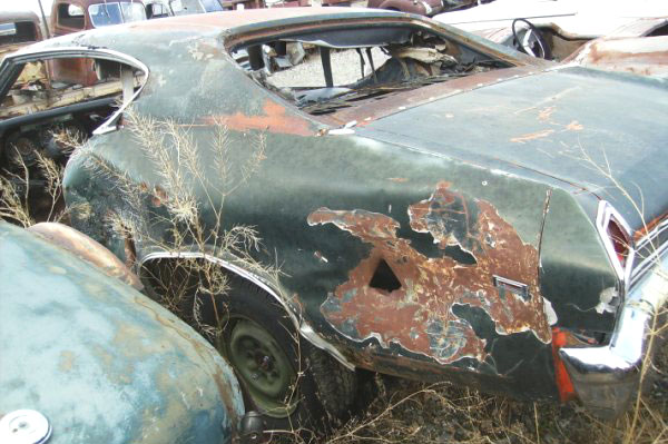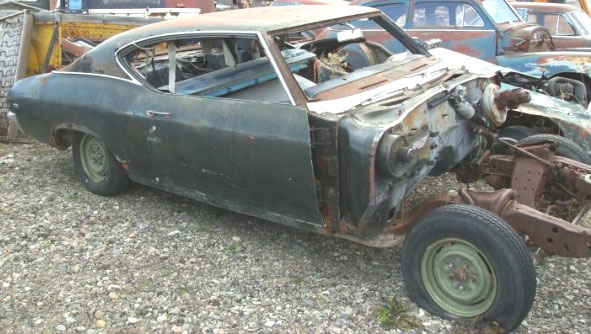 This Fathom Green 1969 Chevrolet Chevelle 2 door hardtop sport coupe is a real deal SS-396 classic muscle car ready to be restored. This is an original factory 396 CID V-8 automatic car with bucket seats and console floor shift. The car has power steering, power brakes and optional air conditioning. This is a desirable paint code 57 Fathom Green car with a black interior. The front body, motor, transmission, a/c system and radiator are missing. The body generally has very solid sheet metal. The left quarter panel is damaged and needs to be replaced. There is a little rust around the right rear wheel well. Otherwise the body is straight and solid. All the glass and window trim is gone. The tail lights are broken, the deck lid lock is gone and the deck lid Chevelle badge is broken. The rear bumper is bent and dented. The original rear panel SS 396 badge is there. The left pillar trim is missing. The left door is gone. There is a good left door inside the car as well as an extra right door. We have the from cross frame assembly and grill. The car has a 756 trim code which is black bucket seat interior with console. The black bucket seats are there. The console and rear seat bottom are missing. Someone was in the process of making this a four speed manual shift car and manual pedals have been installed. A rough shifter hole was started to the left of the factory automatic console opening but the factory opening was not cut. Parts of the dash are missing. The SS-396 dash trim piece is there. All the gauges are there. The glove box door is there The right a/c outlet is there. The steering wheel is gone. The floors and trunk bottom are solid. The car has a Fremont, CA 2C build date of February 1969 third week. The VIN is 13637Zxxxxxx and the car comes with a clear Montana title. It is not often a 69 Chevy SS-396 car like this comes along so don't miss this chance to built this very desirable muscle car. Please call (406) 318-0270 for details about this restorable classic project car.