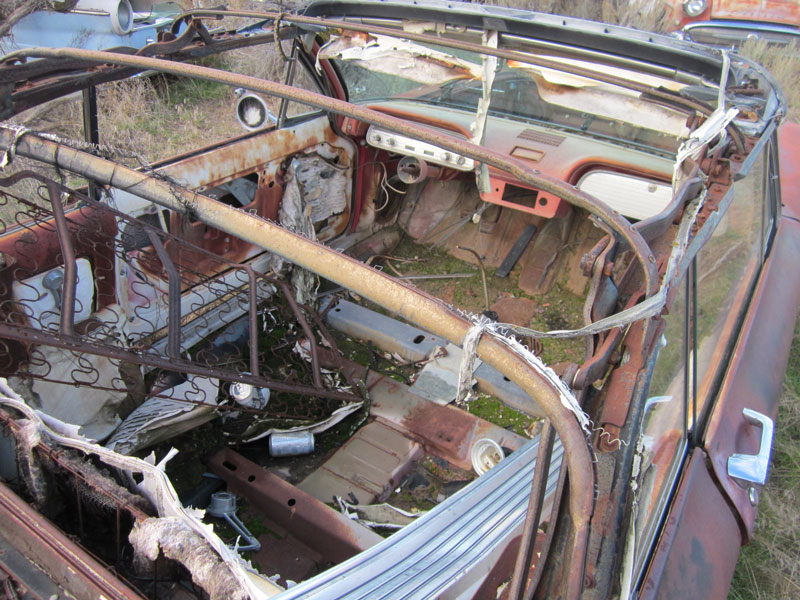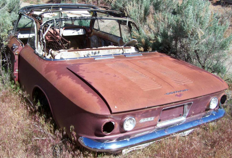 This Riverside red 1963 Chevrolet Corvair Monza Series 900 convertible is a partially complete classic car ready to be restored or customized. It comes with a yellow parts car that has most of the major missing parts, such as bucket seats, hood and power train. The body has solid and dry high western desert sheet metal. The windshield is cracked. There is a dent in the back of the right front wheel well. The right rocker trim of off the car and has a couple bends. The trunk floor and engine bay are solid. The antenna, brake lights, backup lenses and headlight bezels are missing. The bumpers have a couple small dents. The left front turn lens is missing. The deck lid lock and Corvair symbol are missing. There is a small dent above the right headlight. The car has a white interior. The right front floor has some rust. The rest of the floor looks solid. The steering wheel and radio are missing. The top is all there. The car comes with rebuildable core seats, good hood, rebuildable core 145 CID OHV opposed six cylinder pancake dual 1V 80 HP motor and transaxles, wheels and steering wheel. Here is your opportunity to restore or customize a hard-to-find 63 Corvair Monza convertible.