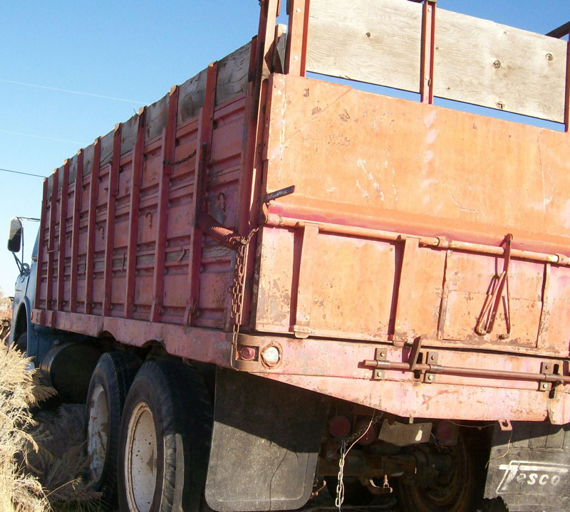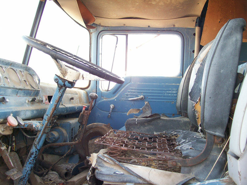 This light blue 1965 Ford C-950 Custom Cab Super Duty Model C956 COF cab-over-body hoist stake bed truck is a very complete commercial farm vehicle ready to be restored or customized. The 34,000 GVW truck has dual tandem rear wheels and the back dual is a tag axle. The body has solid and dry western desert sheet metal. The truck has a scarce optional day sleeper cab. The front bumper is dented. Both cab corners behind the bumper are dented. The grill is damaged on the top left. There is a dent in the top of the right fender. The hydraulic hoist box is a steel and wood flatbed with removable stake bed side and wood top extensions. The box is in fairly good condition. It has some welded brackets, cuts and modifications here and there typical for a commercial farm truck. The blue and black interior is all there except the radio is gone. The dash, controls and gauges are all there. The right floor battery box cover is gone. The top of the air cleaner is on the cab floor. The truck has a Ford big block 534 CID OHV Super Duty V-8 motor, five speed manual floor shift transmission and two speed differential. The truck has air brakes. The truck was running and driving when it was retired many years ago. Here is your chance to own and build a desirable 1965 Ford COF.