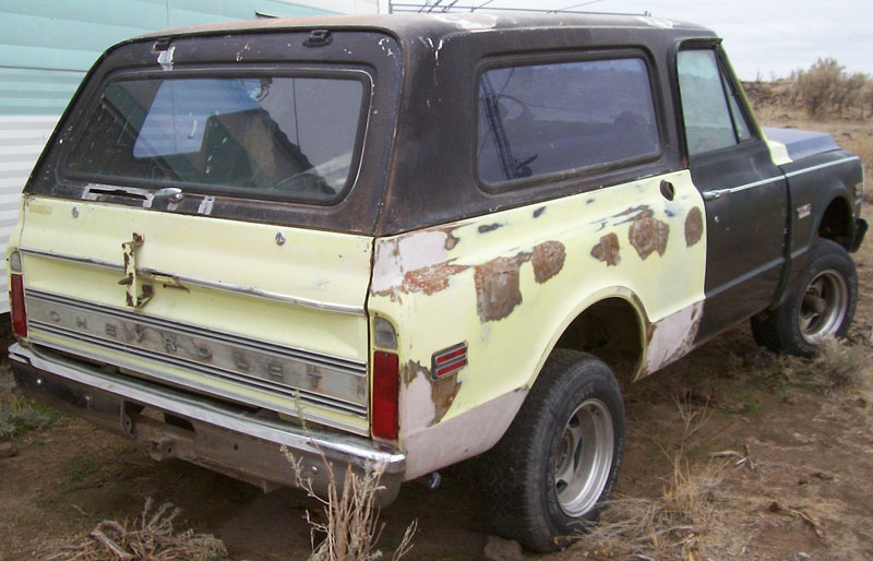This yellow 1972 Chevrolet Blazer Model K Series 5 1/2 ton 4X4 open utility truck with black top is a mostly complete project truck ready to be restored or customized. The truck has a GMC front body and doors that have not been completely installed. The body has dry and solid western desert sheet metal. The front fender badges are GMC. There is a dent in the front of the left front fender. Sheet metal body work have been started all around the body. All the curved glass is good. The wiper blades and antenna are missing. There are dents in the rear body corners. There are dents in the lower tail gate trim and there is a cut in the upper tail gate in the left lower sheet metal. The truck has chrome spokes wheels, lift kit and tow hitch. The 350 CID 4V OHV V-8 motor, automatic transmission have just been rebuilt and the truck runs and drives. The air conditioning system is missing and there is a new heater. The truck has power steering and power brakes. The yellow and green interior is missing the rear seat, dash trim and some control and dash knobs. The floor is solid. Here is your opportunity to restore or customize a 72 Chevy Blazer with a mostly-rebuilt power train.