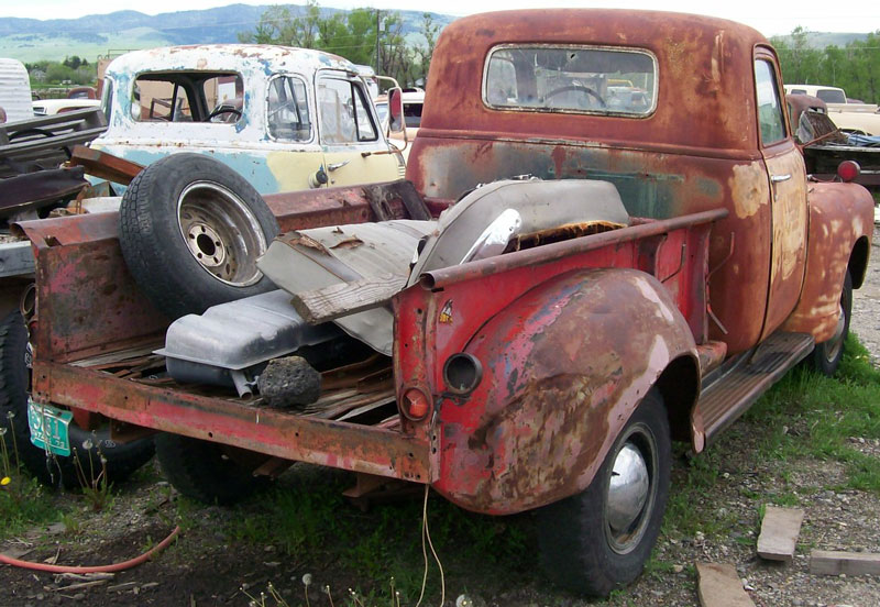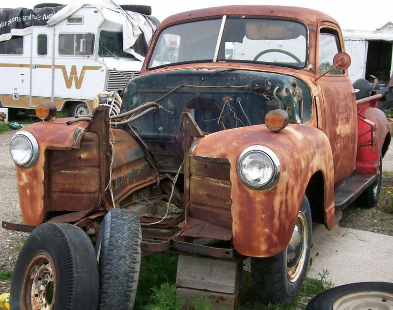 This Wendgor blue 1948 Chevrolet Model FP Series 3100 1/2 ton pickup truck is a partially-complete body and chassis ready for restoration or customization. The truck was a commercial truck for a concrete company in Manhattan Montana. The body has solid and dry western desert sheet metal. There is no grill, hood, tailgate and bumpers. The right front and rear fenders are dented. The left rear fender has some dents and scraps. The running board edges are dented. The right running board splash panel is damaged. There are some bolt holes in the back of the cab and in the body. The truck has a left side box spare mount. There are bar brackets on the right front side of the box to store a hose. The seat is not stock. The dash and gauges are all there. There is an add-on dash cigarette lighter with no lighter. The floors are solid. There are under-dash add-on gauges and steering column-mounted turn signals. The 216 CID OHV 90 HP inline six cylinder motor, bell housing and clutch and radiator are missing. The original 4 speed manual floor shift transmission is there. Here is your chance to restore or customize a 48 Chevy pickup. Please call (406) 318-0270 for details about this restorable classic 1948 Chevrolet project truck. For sale $2,000.
