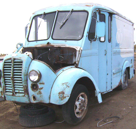 This very scarce blue 1963 DIVCO Series 304 Model 374 multi-stop delivery dairy van is a very solid truck ready for restoration. The van came from Young's Dairy in Jerome, Idaho. The GVW is 9,500 lbs. with a 4,302 payload (80 cases). The truck is set up for sit-or-stand driving. The body and chassis are solid except of one small area in the left rocker forward of the rear wheel well. The reason this truck is so solid is because it comes from high-and-dry southern Idaho where salt was not used on the roads in winter when this van was in service. The front body was off and we sat it in position for the photos. It will be bolted in for shipment. There are small repairable dents in the front body and fenders. The left rear fender is dented. Both bumpers have small dents and the rear bumper is bent, but they are repairable. The doors are all there. The rear door handle is missing. All the glass is good. The hood and front bumper are off the van, see photos. The box is very straight and solid. The box interior has been lined with non-stock wood for a camper. The dash is all good and the instrument panel is complete. The driver's seat is missing. The floors are solid. The motor is out and apart inside the van. There is no inventory of the motor parts and the completeness is unknown. The rest of the drive train and controls are all there. The gas tank is good. The suspension appears to be in good condition. The VIN is 374-3511 and it comes with a title.