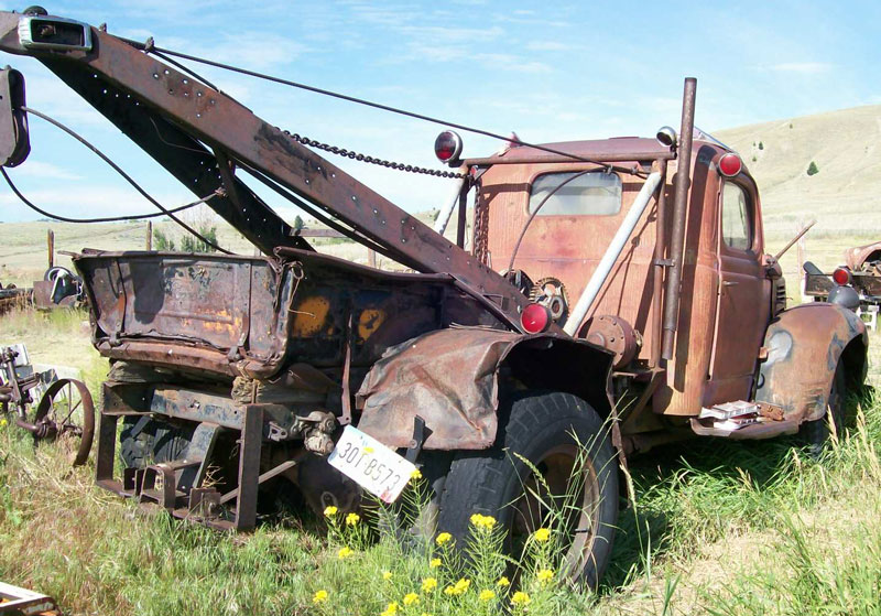 This black 1944 Dodge Model WFA 36 SWB 1 1/2 ton 14,000 GVW wrecker tow truck is a very solid truck ready to be restored. The wrecker body is home-made and is power by a PTO with gear reduction box and cable winch. The truck was running when it was retired a few years ago. The cab has solid, no-rust sheet metal. The grill has some dents. The front fenders are dented and has some welded tears. The right headlight bucket is bent over and the left one is dented in the back. The right door lock is gone. The rear fenders are dented. The interior is all there. The 236 CID L-head inline six cylinder motor and 4 speed manual transmission are all there. The truck comes with a good Montana title. This is a solid big work truck that could be restored or turned into a tilit-back car hauler.