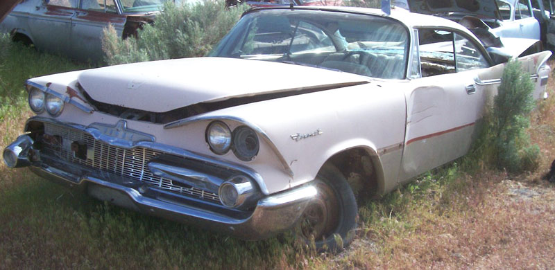 This pink and pewter 1959 Dodge Coronet Lancer 2 door hardtop is a hard-to-find big fin classic car ready to be restored. The windshield is good and the rear glass is broken. The top windshield trim is missing.  The right horizontal grill bar is missing and the left one is dented. The right fender and hood are dented near the headlight. The left headlight trim is missing. The left door and quarter are dented and the trim is gone. The right door is dented but the trim looks ok. The right rear fin area and trim are damaged. The panel about the deck lid and deck lid are damaged and the deck lid lock and trim are missing. The tail lights are gone and the rear bumper is damaged beyond repair. The left rear brake drum is missing. The interior is fairly complete are all the seat cores are there. The dash panel as loose and some parts are missing. The radio and horn right are missing. The left door panel is missing. The left front floor pan is rusted and we have not looked at the others but they may be rusted as well. Don't miss out of a chance to build one of the coolest 59 big fin classics. Please call (406) 318-0270l for details about this restorable classic project car.