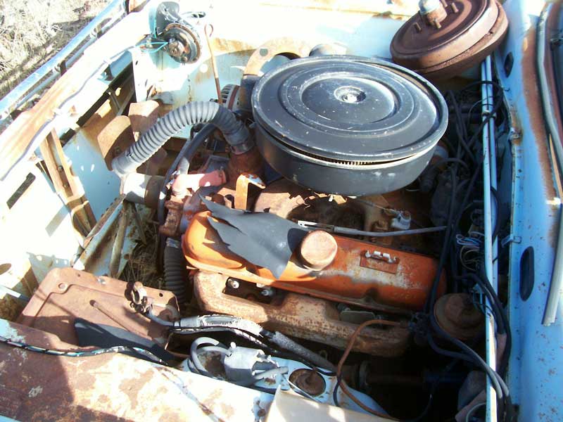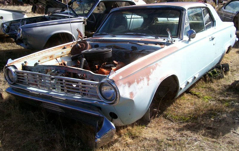 This light blue 1965 Dodge Dart GT 2 door hardtop is a straight and complete classic car ready to be restored or customized. The body has dry and solid western desert sheet metal. The hood and deck lid are missing. A good hood and deck lid come with the car. The front bumper and front of left fender are damaged. The right front fender and trim have damage from a scrape. The windshield is cracked. The rest of the glass is good. The tail light assemblies are gone. The rear bumper is bent on the left side. The left front brake drum is off the car and in the engine compartment. The blue and black bucket seat interior is all there except the steering wheel, column hub, radio and door handles are missing. The floors and trunk bottom are solid. The optional 273 CID OHV 180 HP motor and automatic transmission are complete. The radiator is missing. Don't miss this opportunity to build a 65 Dart GT with a V-8 motor. Please call (406) 318-0270 for details about this restorable classic project car. For sale $4,500.