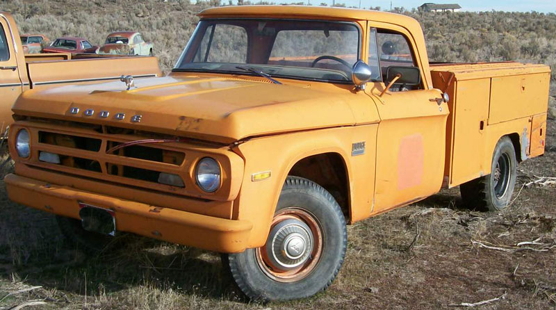 This orange 1971 Dodge D200 3/4 ton 4X2 utility box truck is a very solid and complete work vehicle ready to be restored. The body has excellent dry and straight western sheet metal. There are some small dents in the front of the hood. The are dents in the left lower front door and rear of the fender. The left rear of the box has a scrap. There is a little rust in the right rocker and lower door corner. There are add-on mirror holes in the doors. There is a front adjustable spot light and rear work spot light. The truck as a commercial 6 compartment box by Utility Body of Oakland, CA. The front of the center area is covered. The truck has a heavy duty rear tow bumper. The truck has the larger 383 CID 258 HP OHV V-8 motor with power steering and power brakes.The automatic transmission is missing. The motor is complete and nothing has been taken off.The running condition is unknown. The truck had a snow plow mount and the Western snow plow controls are still there. Here is your chance to restore and use a nice 71 Dodge commercial work truck. For sale $6,000.