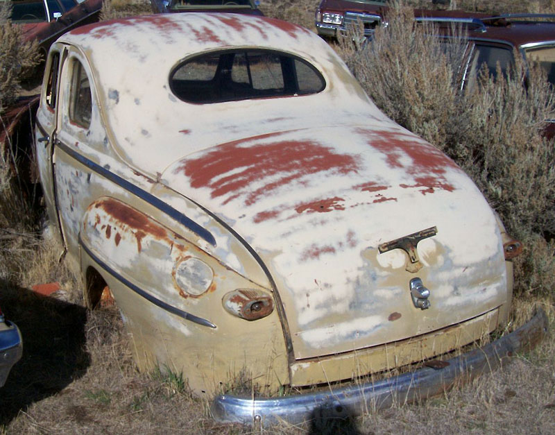 This 1948 Ford Super Deluxe 5 window 3 passenger coupe is a very solid, fairly straight car body ready to be restored or customized. This is the very scarce slant deck coupe that is highly desirable for hot rods or customs. The Super Deluxe is the top trim line for 1948 and features chrome exterior window molding. The sheet metal is very solid, straight and rust-free. The grill and front bumper are off the car and are dented. The hood is missing. The tail lenses are gone. The rear window trim is missing. The dash is missing. The seat core is there. The front floor pan is missing. The rest of the floor and trunk bottom are solid. There is no motor, transmission or axles. We will put the body on rolling axles for shipping. It comes with a title. Don't miss this opportunity to build a very sought-after 3 passenger 48 Ford slant deck coupe with great sheet metal. Please call (406) 318-0270 for details about this restorable classic project car. For sale $6,000