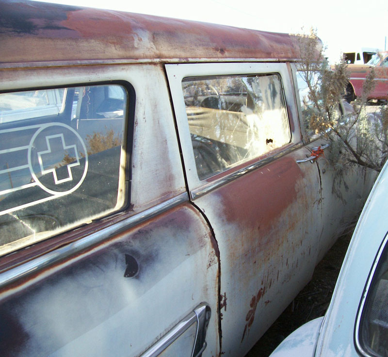 This Sandpiper beige 1952 Ford Customline V-8 station wagon is a special order commercial ambulance ready to be restored. The car is very solid and complete. The body has rust-free western desert sheet metal. The ambulance features include top front and rear red lights, suicide-style rear side doors, single right-opening rear barn door, passenger compartment divider with sliding window and rear area stretcher deck. All of the special ambulance components are there. The Ford hood badge is gone. The right front of the hood is dented and the hood hinges are bent. The grill has surface rust. The right front parking lenses is gone and the right headlight ring is dented. There are dents in the front bumper and the right bumper guard is missing. The driver outside mirror is missing. The windshield has wiper burn. The rain gutter over the windshield is bent. The right rear side and door glass are broken. The right tail light lens is gone. The rear bumper is dented and the bumper guards are gone. The rear door trim is dented. Both rear doors are sprung and there is damage to the sheet metal on both sides of the hinge seam. The trim bars behind both rear doors are dented. There are some dents in the top, mainly on the right side. The brown and grey interior is mostly all there. The front seat is not stock. The dash and gauges are all there except the center dash clock is missing. The floor is solid. The left rear inside door handles are gone. The right rear side window shade is gone. The 239 CID L-head 110 HP V-8 motor and three speed manual column shift transmission are all there. The running condition is unknown although nothing has been taken off the motor and it looks like a runner. The chassis and suspension are stock and in good condition. Here is your chance to restore a one-of-a-kind special order 52 Ford ambulance. Please call (406) 318-0270 for details about this restorable classic project car.