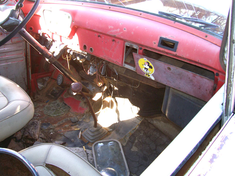 This red 1955 Ford F-100 1/2 ton panel delivery truck is a mostly straight and complete truck ready for restoration or customization. The body and frame are straight and solid, except the rear doors, lower rear panel and left rear wheel well are dented. There is some rust in the top of the left rear wheel well and in the bottom of the right cowl bottom. The grill is good. The windshield and flat glass is broken. The dash is good and all the gauges are there. There are some missing controls, knobs and ash trays. The floors are solid. The bucket seats are not stock. The has add-on turn signals, running board step plates, non-stock wheels, roof rack and roof spot light. The not stock later year Ford 272 CID or 292 CID OHV V-8 motor and 4 speed floor shift transmission are all there. The running and driving condition is unknown. Here is your chance to restore of customize a 55 Ford panel. Lots of these trucks are being rodded, or restored and used as classic delivery trucks.