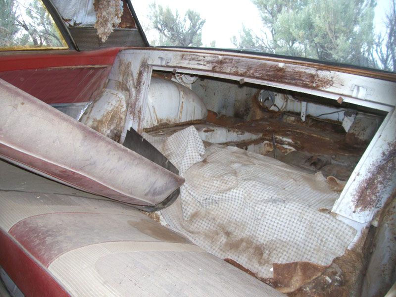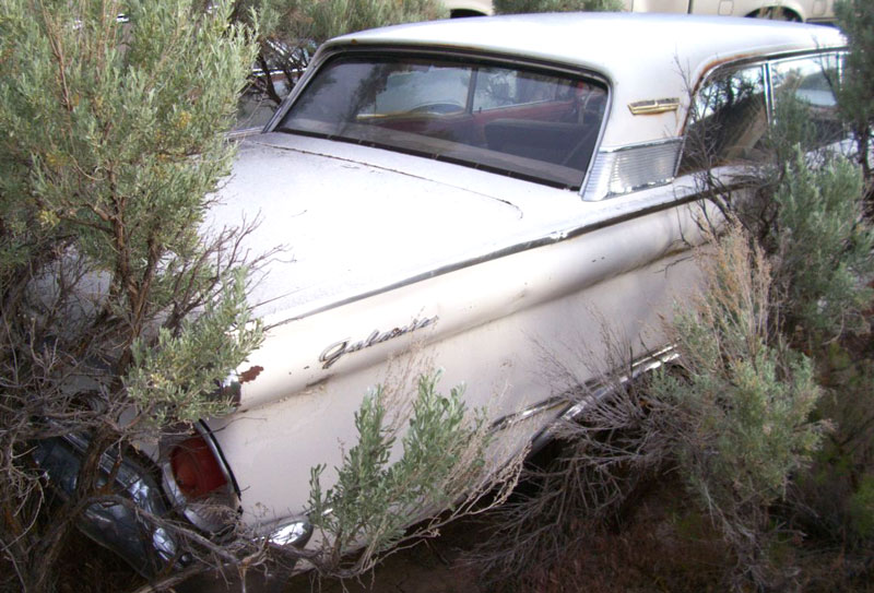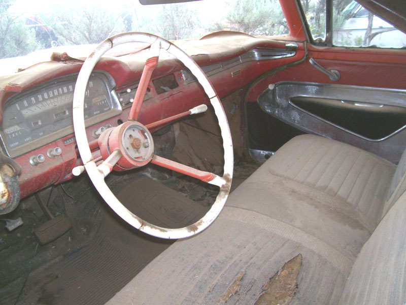 This white 1959 Ford Galaxie Club Victoria V-8 2 door hardtop #1 is a mostly complete classic car ready for a restoration or customization. The grill is good. The right side of the front bumper has been pulled out but it is repairable. The rear bumper is dented and the backup lens are cracked. The rear bumper is dented. Some of the trim is dented. The left front fender is dented between the wheel well and the door. The right front fender is damaged and there is a dent in the right door. the left tail light surround sheet metal is dented. All the glass is good. The red and white interior is misisng the the horn buttom and the ignition switch is missing. The dash is all there except the dash pad is cracked. The radio is missing. The left door panel is dented. The "H" code 351 CID 300 HP V-8 motor, automatic transmission and drive train are all there. Here is your chance to restore or customize a 59 Ford Galaxie 2 door hardtop.