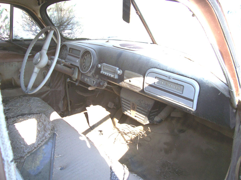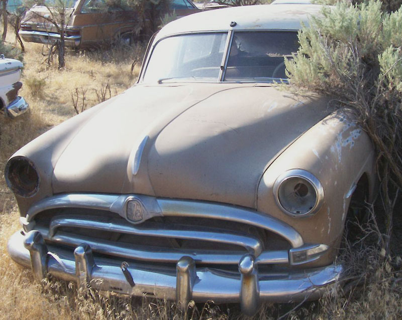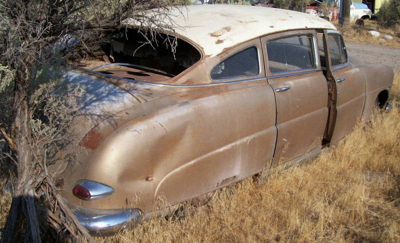 This brown 1951 Hudson Pacemaker 4 door sedan is a dry high desert survivor ready to be restored. The right front fender and quarter are dented. The skirts are missing. The right rocker trim is missing. There is some rust around the right rear wheel well. The rear glass is gone. The rear bumper guards are missing. The back seat is missing. The dash is complete. The hood is stuck. The motor and manual transmission are all there. This Hudson Pacemaker would make a nice restoration or cool custom lowrider. Please call (406) 318-0270 for details about this restorable classic 51 Pacemaker sedan project car. For sale $3,000.