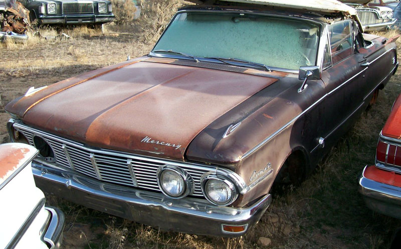 This black cherry 1963 Mercury Comet Special S-22 convertible is a very solid and mostly complete project car body and rolling chassis ready to be restored or customized. The Special has six tail lights and only 5,757 were made in 1963. The body has solid and dry western desert sheet metal. The left quarter panel and fin are damaged. The right grill and hood front are dented and the right headlights are missing. The right fender Comet badge is broken. Otherwise, the rest of the sheet metal is straight and solid. The windshield is good. The top is all there. The white and tan interior is all there except the headlight switch, horn button and radio are gone. The bucket seats are there and the console is missing. The floors are solid. The car had a 144 CID OHV inline six cylinder 85 HP motor and Merc-O-Matic transmission. The motor, transmission, under hood components and radiator are missing. The car has a 5 bolt V-8 differential which is not stock. Here is your chance to restore or customize a 63 Comet convertible. Please call (406) 318-0270 for details about this restorable classic 63 Merc project car.