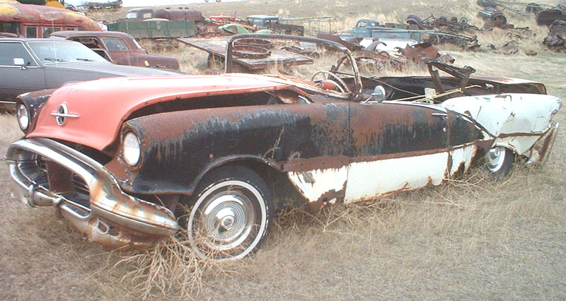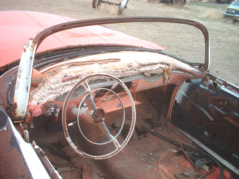 This black and white 1956 Oldsmobile Super 88 convertible is a very scarce find ready to be restored. The body is fairly solid. The quarter panels and right front fender are damaged. The lower front bumper and inner lower grill surround are damaged. The rockers are rusted. Most of the exterior trim is missing. The headlight trim and left tail light lens are missing. The windshield frame is good. All the frame trim is missing. The back corners of the hood are bent. The deck lid lip is rusted. The rear panel below the deck lid is gone. The rear chassis frame is rusted away and the bumper is off the car. The center reinforced convertible X member is usable. The floor and trunk bottom have holes. The salmon dash is complete. The seats and rest of the interior are gone. Some of the top assembly is there. The Autronic Eye dimmer is there. The 324 CID 240 HP Rocket V-8, automatic transmission and power train are all there except the radiator and air cleaner are missing. The body and VIN tags are there and the car comes with a title. A good 2 door hardtop will be needed to build this convertible. Here is the opportunity to build highly-desirable 56 Olds Super 88 convertible. Please call (406) 318-0270 for details about this restorable classic 56 Olds project car. For sale $4,000.