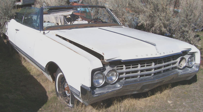 This white 1965 Oldsmobile 98 convertible is a very straight, complete classic car ready to be restored. This car is top-of-the-line for Olds in 1965. Only 4,903 were made. The car has power windows, brakes and steering. There is a little rust behind both wheel wells. The paint is bubbling and may have rust in the left quarter panel and inside the right back panel near the tail light. The windshield is broken. The black interior is all there. The top is all there. The right side glass is good and the condition of the left side glass is unknown. The floors are solid. The 425 CID 360 HP V-8 is all there. The running condition is unknown. Here is your opportunity to restore a big-boat, top-of-the-line 65 Olds 98 convertible. For sale $6,500.