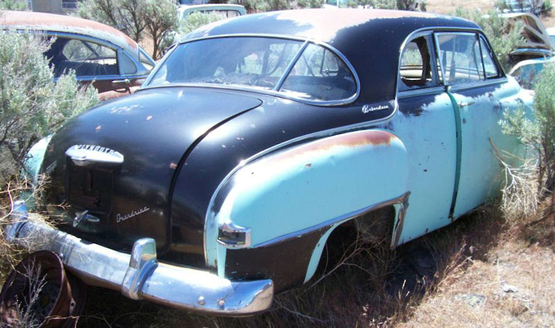 This black and blue 1952 Plymouth Cranbrook Belvedere 2 door hardtop is a fairly complete, straight project car ready to be restored. The rear glass is good. The headlight bezels, antenna and wipers are missing. The tail light lenses are gone. There is a small dent in the right quarter. The left front fender is damaged. There are some small dents in the driver door. The interior is all there. A couple dash knobs are missing. The floors are rusted. The differential is missing but we will provide a rebuildable core rear end under the car. The 218 CID six cylinder motor and 3 speed manual transmission with overdrive are all there. Her is your chance to built and show Plymouth's top-of-the-line 3 window coupe. Please call (406) 318-0270 for details about this restorable classic 52 Plymouth project car.