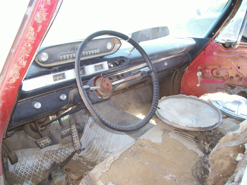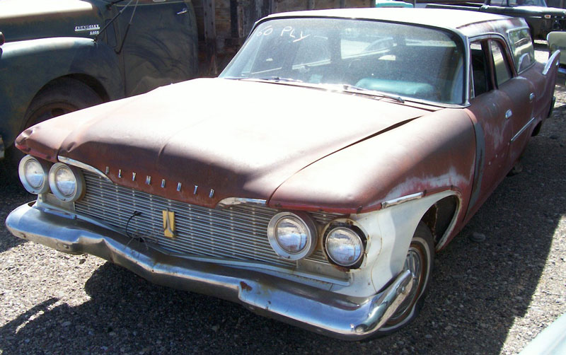 This red 1960 Plymouth Savoy Suburban 4 door station wagon is a fairly solid and complete car ready to be restored. All the glass is good. The front bumper is dented. Most of the trim is missing. The right fender and right hood are dented. The left outer headlight ring is gone. The tail light lenses are broken. There is a little rust around the right rear wheel well. The floor pans have some rust, especially the left rear floor pan. The black, grey and white interior is mostly all there. The radio is gone. The right gauge panel insert is missing. The horn ring is missing. Some of the door panels are partial or missing. The 318 CID 2 barrel OHV 230 HP V-8 motor is missing the radiator, carburetor, air cleaner, generator and water pump. The three speed column shift manual transmission is all there. This 60 Savoy Suburban would make a fun family car restoration project. Please call (406) 318-0270 for details about this restorable classic project car. For sale $3,000.