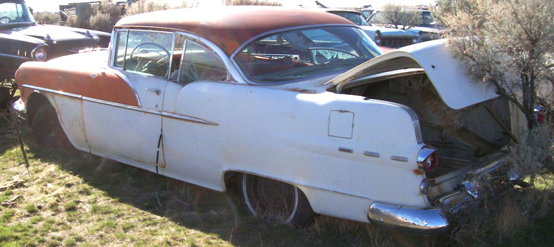 This red and white 1956 Pontiac Star Chief Custom Catalina 2 door hardtop is a very complete, solid scarce coupe car ready for restoration or customization. The grill bar and hood lip trim are dented. The left front fender is dented behind the wheel well. There is a scuff along the front of the right quarter. There is some rust in the lower right front fender behind the wheel well. The windshield and back glass are good and the flat glass is broken. Both stainless top door trim pieces are missing. All the trim is there except the Star Chief badges are missing. The white, red and black interior is all there. The dash is complete except the radio is missing. The floors are solid. The 317 CID 216 HP Star Chief V-8 is missing the radiator, carburetor, air cleaner and generator. The car has a Strato-Flight Hydra-Matic automatic transmission. This Star Chief Catalina coupe is the top-of-the-line for Pontiac in 56. Good solid ones like this are very hard to find so don't miss this opportunity. Please call (406) 318-0270 for details about this 56 Catalina coupe. For sale $7,500.