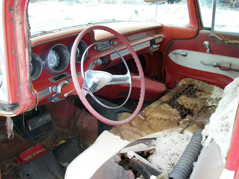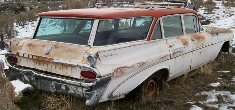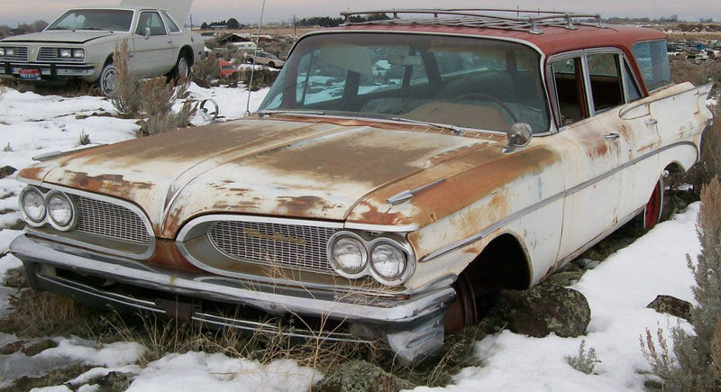 This Cameo Ivory and Sunset Glow red 1959 Pontiac Catalina Safari 9 passenger station wagon is a very complete classic wagon ready to be restored. The body has solid, dry and straight sheet metal except for small rusted areas in the left front fender tail and right rear quarter tail. The left front wheel well and trim are bent out at the front top. The rear bumper is dented. All the trim is there except the left tail gate trim is missing. There are a few small dents in the right top above the quarter window. The right side exterior mirror lenses is missing. The red and white 9 passenger interior is very complete except the center dash ash tray is missing. The heater core and housing is out and on the front floor. There is an add-on gauge set below the dash. The floors are solid. The car has power steering. The 389 CID 2V OHV 245 HP V-8 motor and three speed automatic transmission are there. The air cleaner is missing. The power steering connecting rod from the steering column to the steering gear box is missing. The running and driving condition is unknown. Here is your chance to restore a very complete 59 Safari 9 passenger wagon.