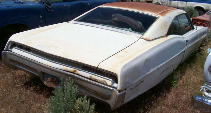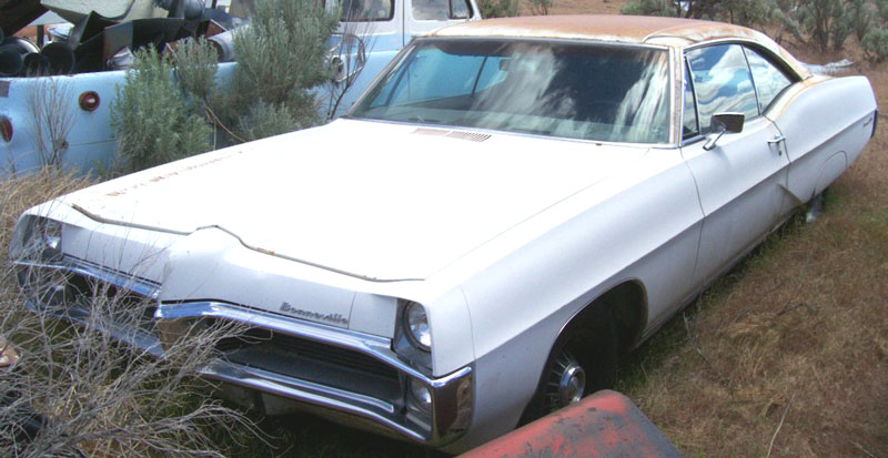 SOLD:This white 1967 Pontiac Bonneville 2 door hardtop is a very complete, solid car ready to be restored. This car had a Cordova vinyl top, power brakes, power steering, power windows and air conditioning. It has scarce optional 8 lug wheels. The trim rings are gone. All the glass is good. There are scratches on the top of the left front fender and hood. There is a dent in the left quarter and the bottom trim is gone. The right quarter and skirt are dented. There is damage to the right rear bumper and center panel. The red interior is all there. The radio is missing. The floors look solid but the carpets have not been pulled up. The trunk is locked so no inspection of the trunk floor was done. The 400 CID 333 HP V-8 and Turbo-Hydramatic automatic transmission are all there. The running condition is unknown. This is a good, solid complete car and you won't be chasing parts to restore it...plus you get the desirable 8 lug wheels. Please call Steve Murphy at (406) 565-5277 for details about this restorable classic project car. For sale $5,500.