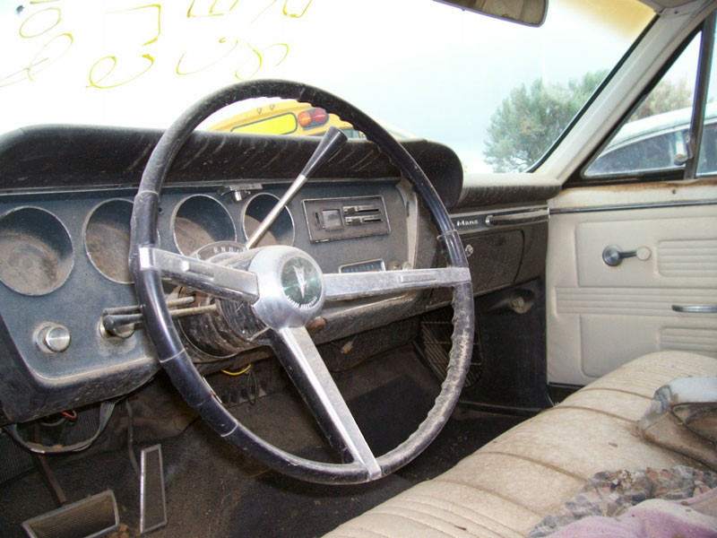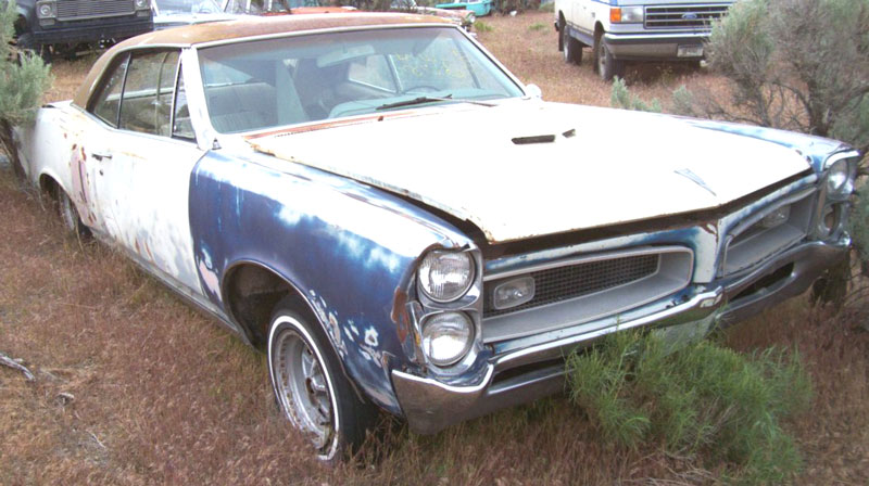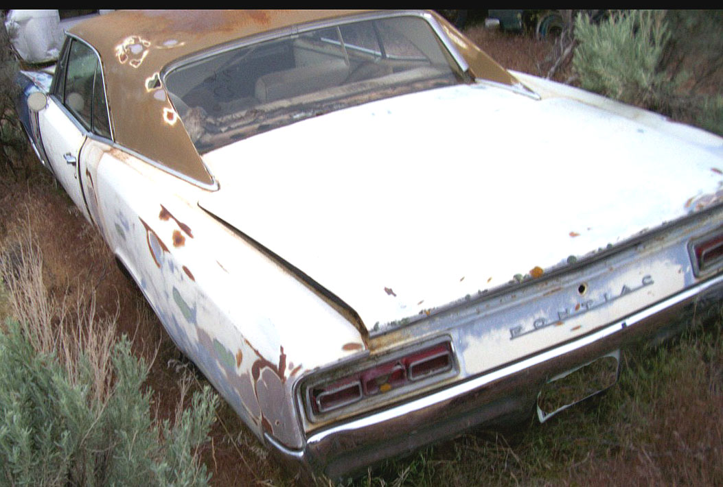 This Tyrol blue 1967 Pontiac Tempest LeMans 2 door hardtop is a very straight body and rolling chassis ready to be restored or turned into a GTO clone. The body has dry and straight western sheet metal. The front of the right front fender near the headlight is damaged. The left side of the front bumper and grill surround trim is dented. The rest of the body is straight. Some paint preparation work has been done. The deck lid lock is gone. The car has a GTO hood. The rear quarter 3 slot trim pieces are missing. The black and white bench seat interior is all there. The dash and gauges are all there. The floors are solid. This was a V-8 automatic transmission car and the motor , transmission and radiator are missing. The car has power steering and power brakes. It has rallye wheels. Here is your chance to restore or customize a desirable 67 LeMans 2 door hardtop.