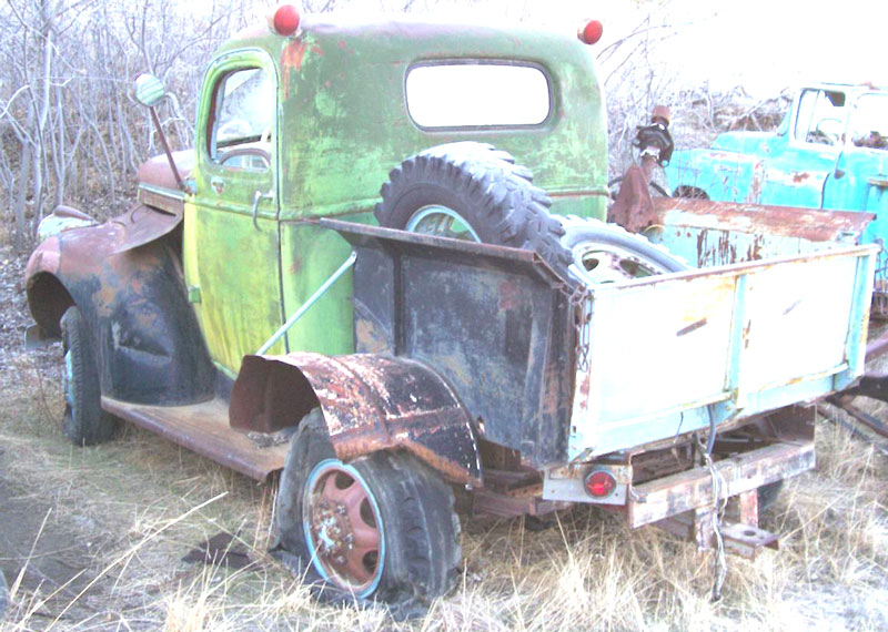 This green 1947 GMC Second Series EC-262 one ton truck was shortened many years ago and used as a mobile home tractor. The back bed, homemade rear fenders and bumper are not stock. The hood is missing (the one in place is to protect the motor). The top center grill is missing. The front fenders, cab and running boards are solid. There is a repairable dent in the back of the left fender. The right parking light is missing the left parking light lens is missing. The blue and black interior is all there. The floors are solid. The motor and drive train are all there. I do not have a motor photos but it is complete and looks like a runner. However, we do not know of the running condition. With all the chassis shortening completed, this truck when restored would make an excellent tow vehicle because of it's maneuverability. Please call (406) 318-0270 for details.