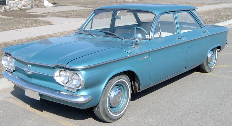 This teal blue 1961 Chevrolet Corvair Deluxe Series 700 4 door sedan is an all-original, low-miles daily driver ready to be restored or enjoyed the way it is. The paint is faded and there are typical chips and scraps for original paint of this age. There are a couple minor dents in the trim. All the glass is good. The gray, blue and white interior is in fairly good condition. The 145 CID horizontally-opposed six cylinder 80 HP "pancake" motor and automatic transmission are working normally. There odometer reads 45,422 and this is the original mileage. The car runs and drives great. Here is you chance to own and drive a very nice 61 Corvair family sedan at a below-market price. Please call (406) 318-0270 for details about this restorable classic project car. For sale $4,000.