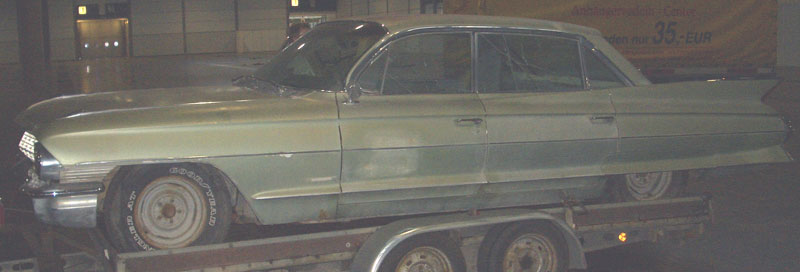 This metallic green 1961 Cadillac Series 62 six window 4 door hardtop is a solid straight Nevada project car ready to be restored. This is the first car I ever sold after I started DesertClassics.com in 2002. I bought the car from a tow truck driver who was moving from Elko, Nevada where I then lived to Wyoming. He could not take the car with him and sold it to me. I sold the car to Norbert Altmann of Hoppegarten, Germany. This picture is of the car in Norbert's warehouse in Germany. Norbert and his wife Birgit have become very good friends and last year they came to Butte, Montana to visit. We had a great time. Norbert has a number of early Cadillac cars that he has restored. In his local car club, he is known as "Cadillac Cowboy" and he loves to have barbecues in his back yard with his friends. The picture of Norbert and Birgit was their Christmas card last year.
