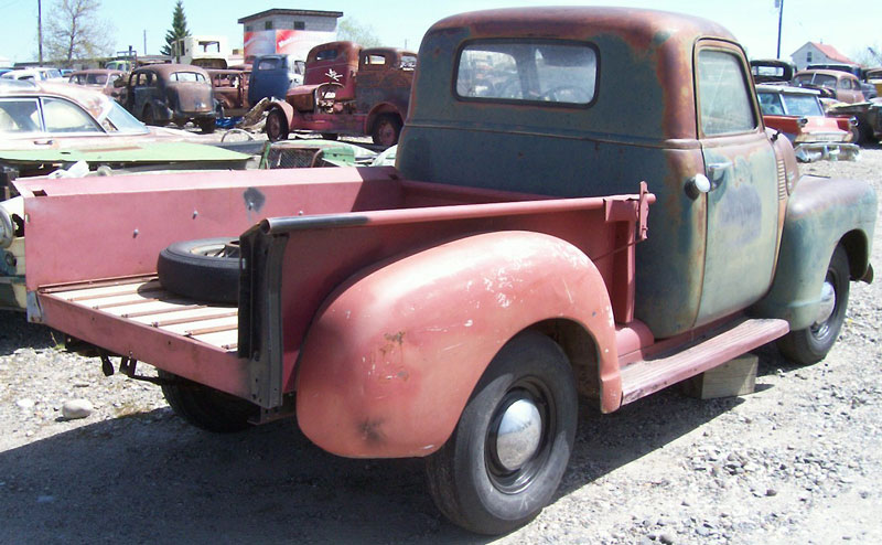 This green 1949 Chevrolet 1/2 ton pickup is a very solid, straight pickup truck ready to be restored. The truck has a 3100 Series 1/2 ton chassis with a 3800 Series cab and 1/2 ton bed. The cab is the same for 3100-3800 series trucks. The body is very solid and not rusted. The right front fender has a scrape. It has a non-stock upper center hood ornament. The grill bars have some dents. There is no tail gate or rear bumper. It has an after-market spot light. The hood is stuck. The truck has a none-operating, not stock power train which is not hooked up and is missing parts. The hood is stuck so I do not have a photo of the engine compartment. The interior is all there. The gauges are complete. The floor is solid. If you are looking for a 49 Chevy pickup with good, solid, straight sheet metal, this is the one for you. Please call (406) 318-0270 for details about this restorable classic project truck. For sale $3,000